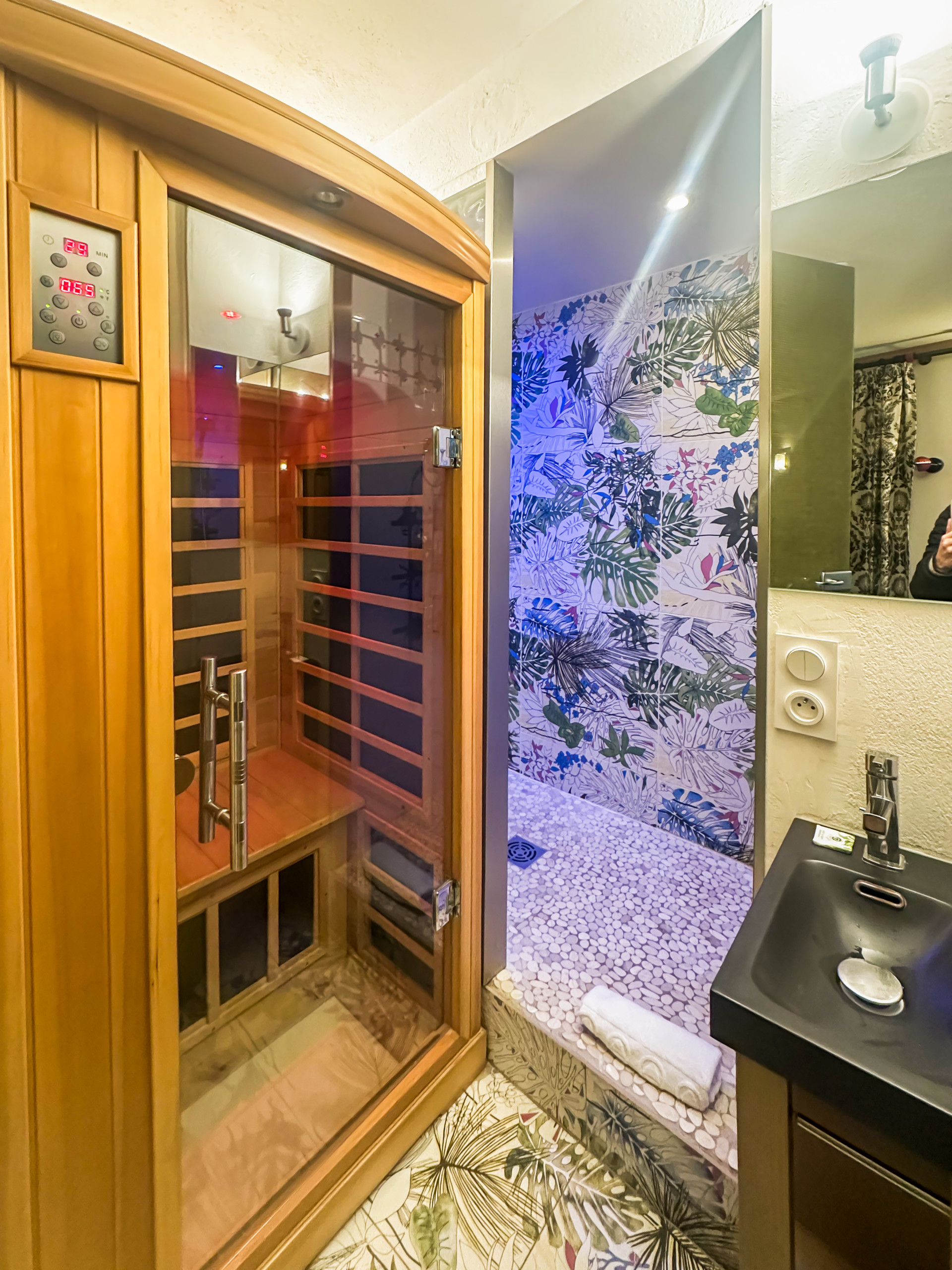 A shower room with a small sauna.