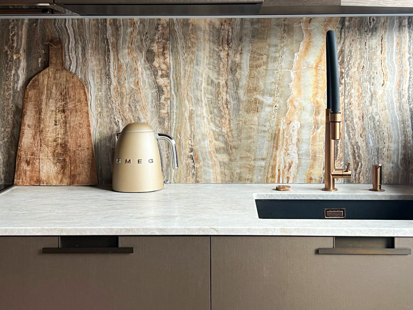 The apartment also features an elegant gas fireplace, creating a warm and refined atmosphere, as well as an ultra-modern open kitchen.
