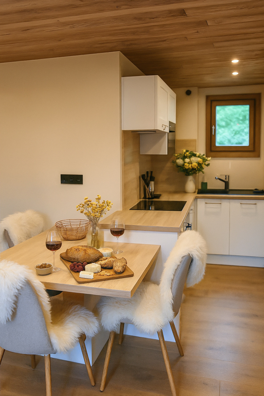 A fully equipped kitchen open to the living room (Nespresso machine, hobs, extractor hood, refrigerator).