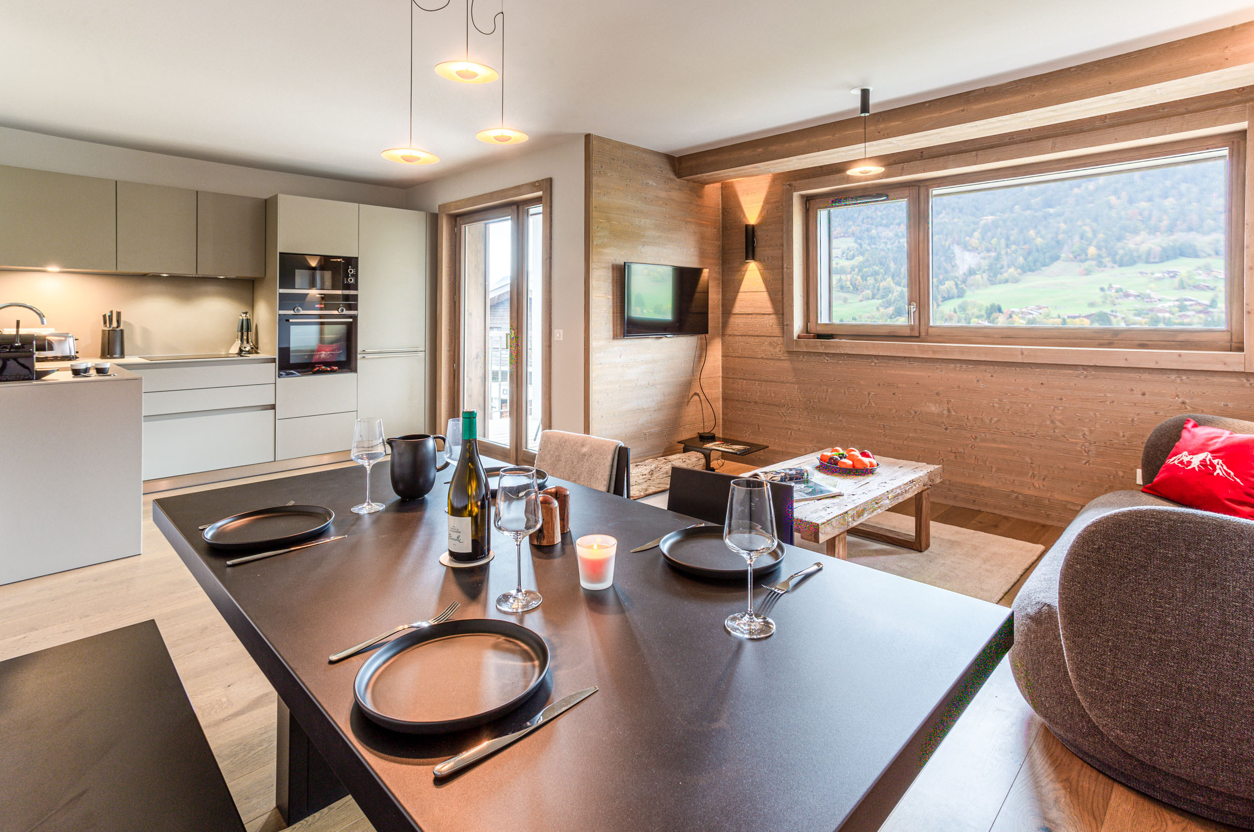 A fully-equipped kitchen opening onto the living room (Nespresso machine, induction hob, hood, freezer, fridge, dishwasher, toaster, kettle)