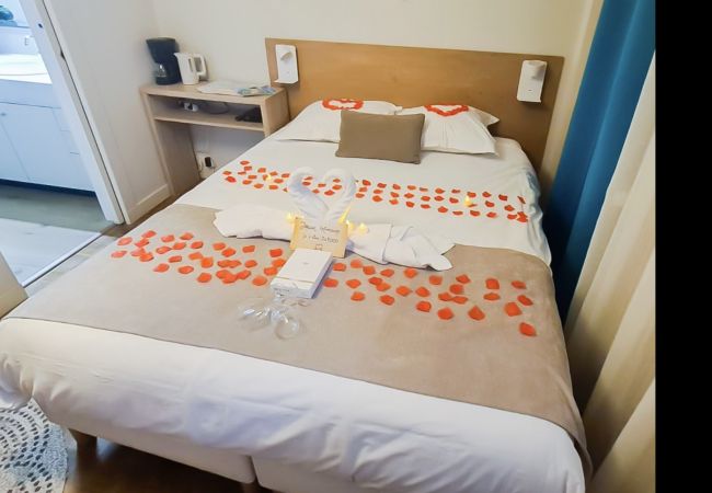 Bunch of roses and heart-shaped petals, candles on the bed, personalized note + a 75 cl bottle of Champagne