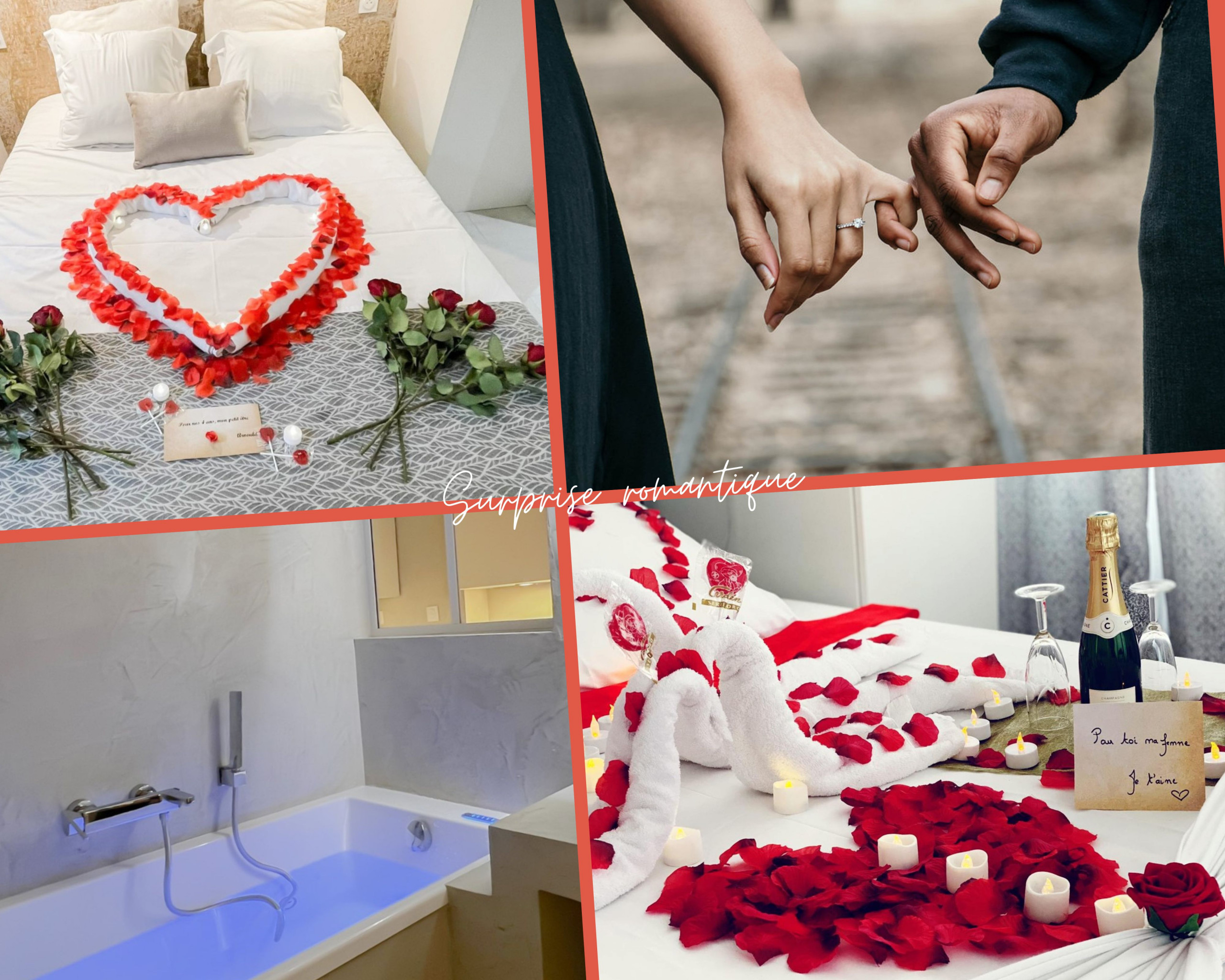 Heart-shaped petals, candles on the bed, personalized note, 1/2 bottle of Champagne from Cattier Brut Premier Cru.