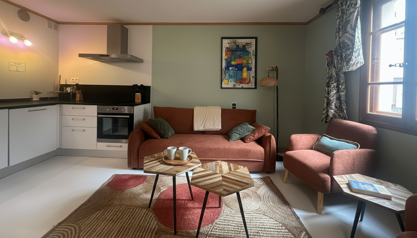 Appartement lumineux, à l'ambiance cosy et moderne, où règne une atmosphère apaisante. Son design épuré et fonctionnel permet de vous accueillir avec tout le confort nécessaire. Chaque espace a été soigneusement aménagé pour vous offrir une expérience agréable et conviviale.