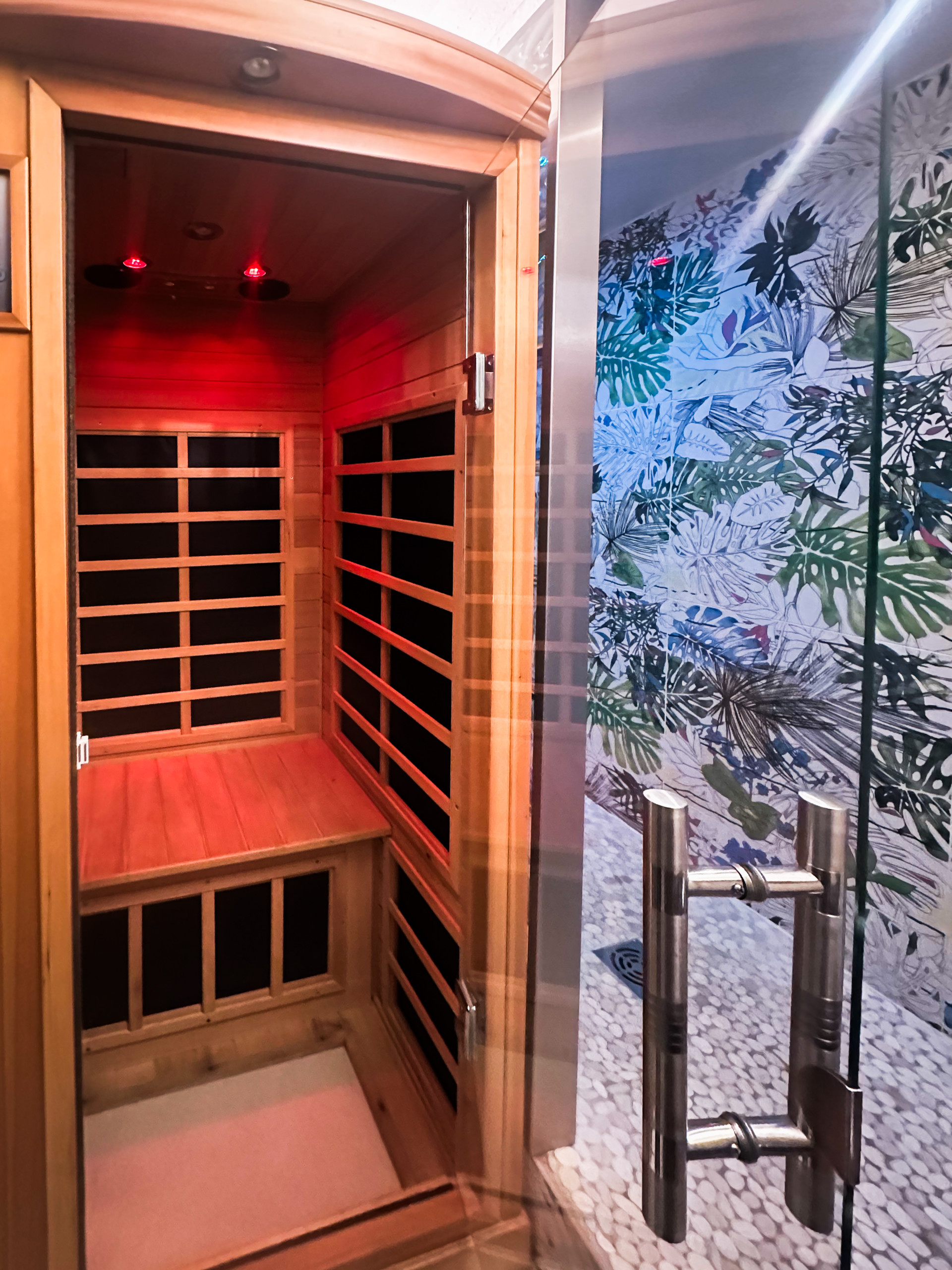 Une salle de douche avec petit sauna.