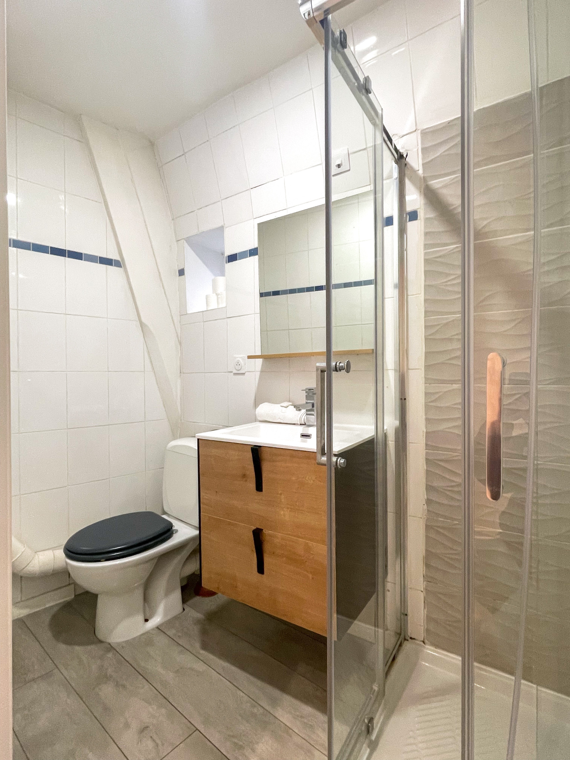Une salle de bain fonctionnelle : douche, sèche-serviette et sèche-cheveux inclus