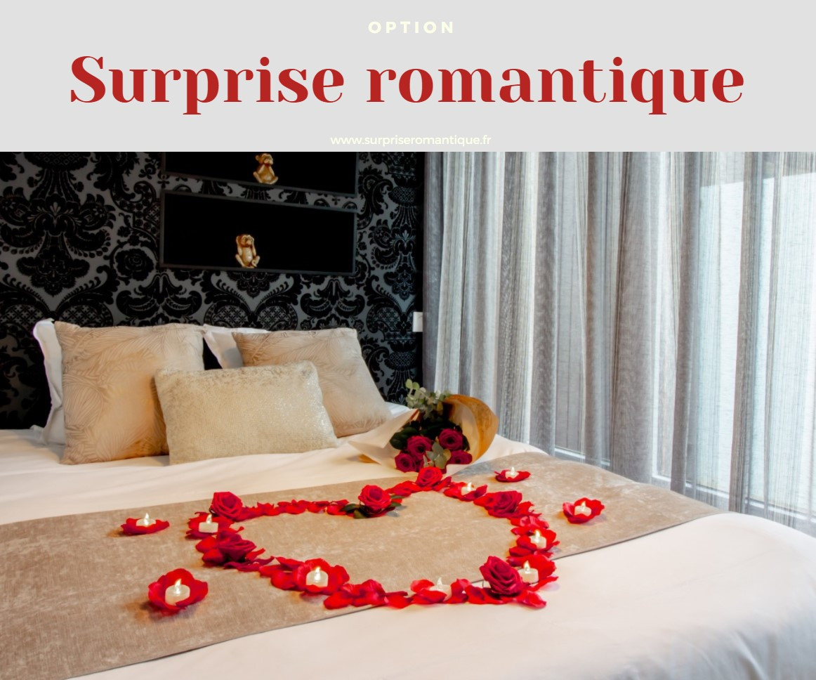 Bouquet de roses et pétales en forme de cœur, bougies sur le lit, mot personnalisé + une bouteille de Champagne 75 cl.
