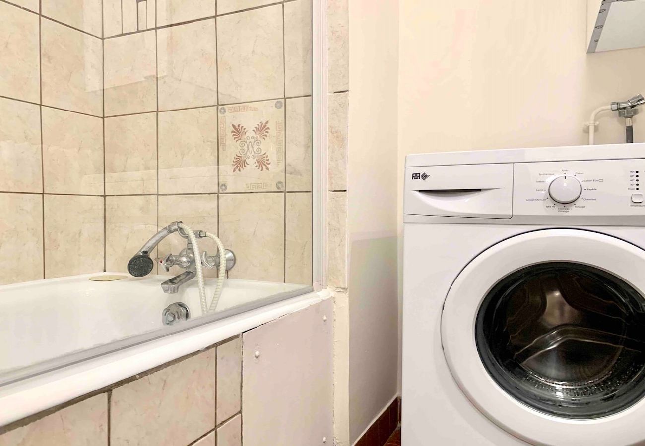 Une salle de bain avec baignoire, lave-linge (shampoing, gel douche et serviette à disposition)