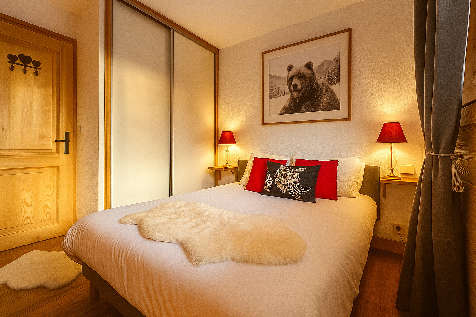 La chambre principale dispose d'un lit double confortable qui garantira des nuits paisibles. La salle de bain avec baignoire vous permettra de vous détendre après une journée d'activités en montagne, offrant un moment de pure relaxation.
