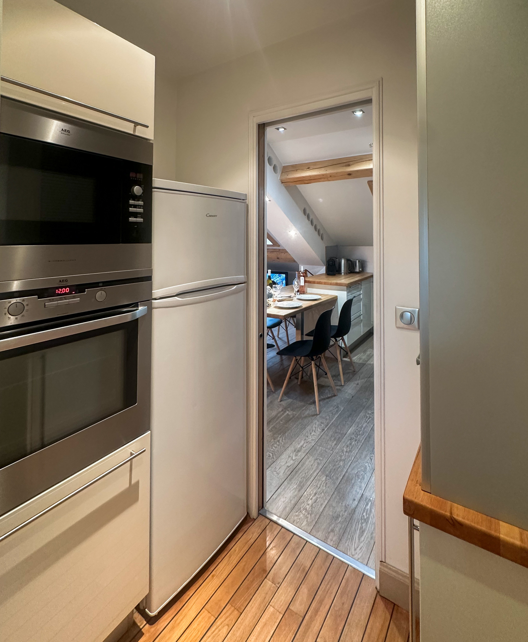 La cuisine américaine, équipée d'une plaque à induction, d'un four et d'un réfrigérateur, vous permettra de concocter de délicieux repas en toute simplicité. Idéal pour les couples qui aiment cuisiner ensemble et partager des moments gourmands.