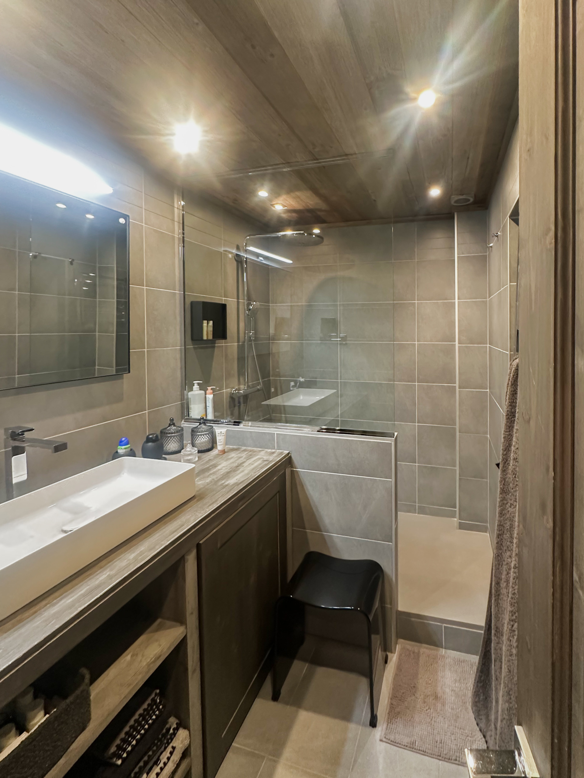 Salle de bain moderne avec douche et lave-linge.