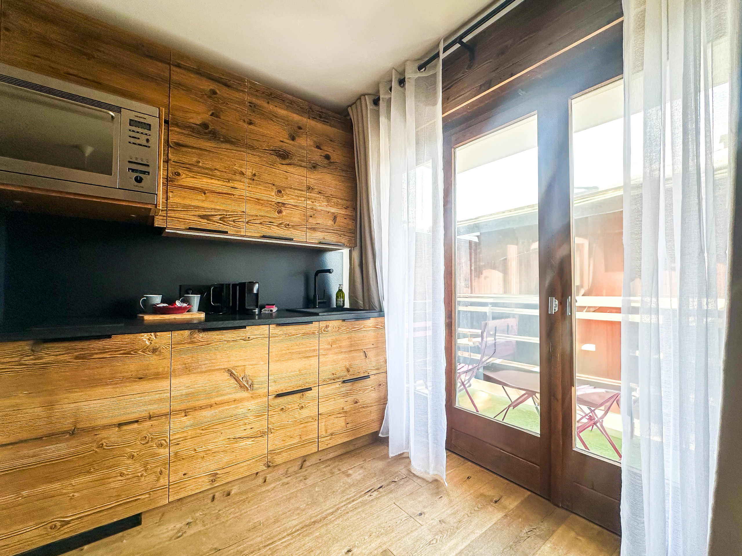 Equipée avec plaques, four, hotte, micro-onde, réfrigérateur, machine à café Nespresso