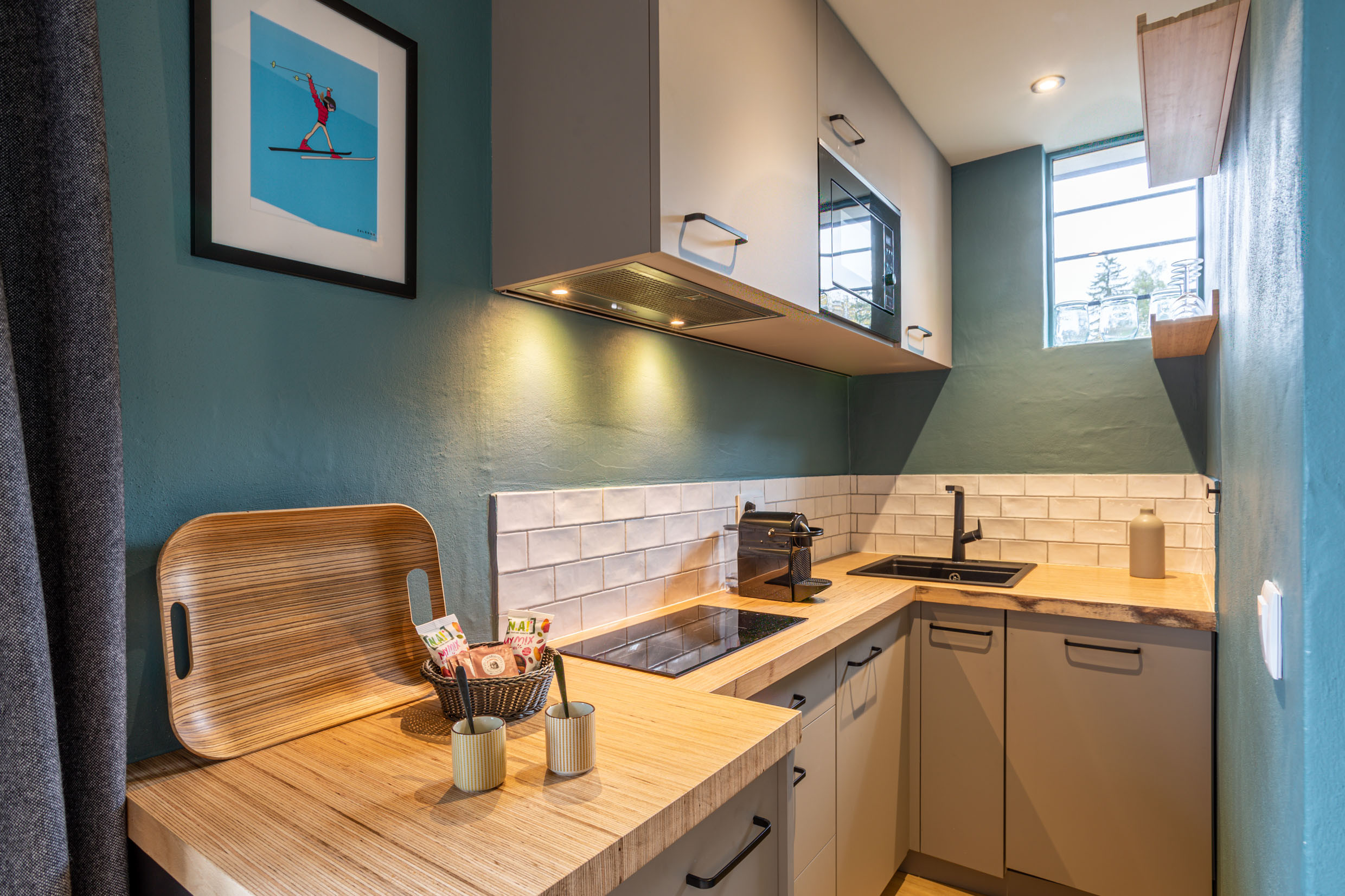 Equipée avec plaques, four, hotte, micro-onde, réfrigérateur, machine à café Nespresso