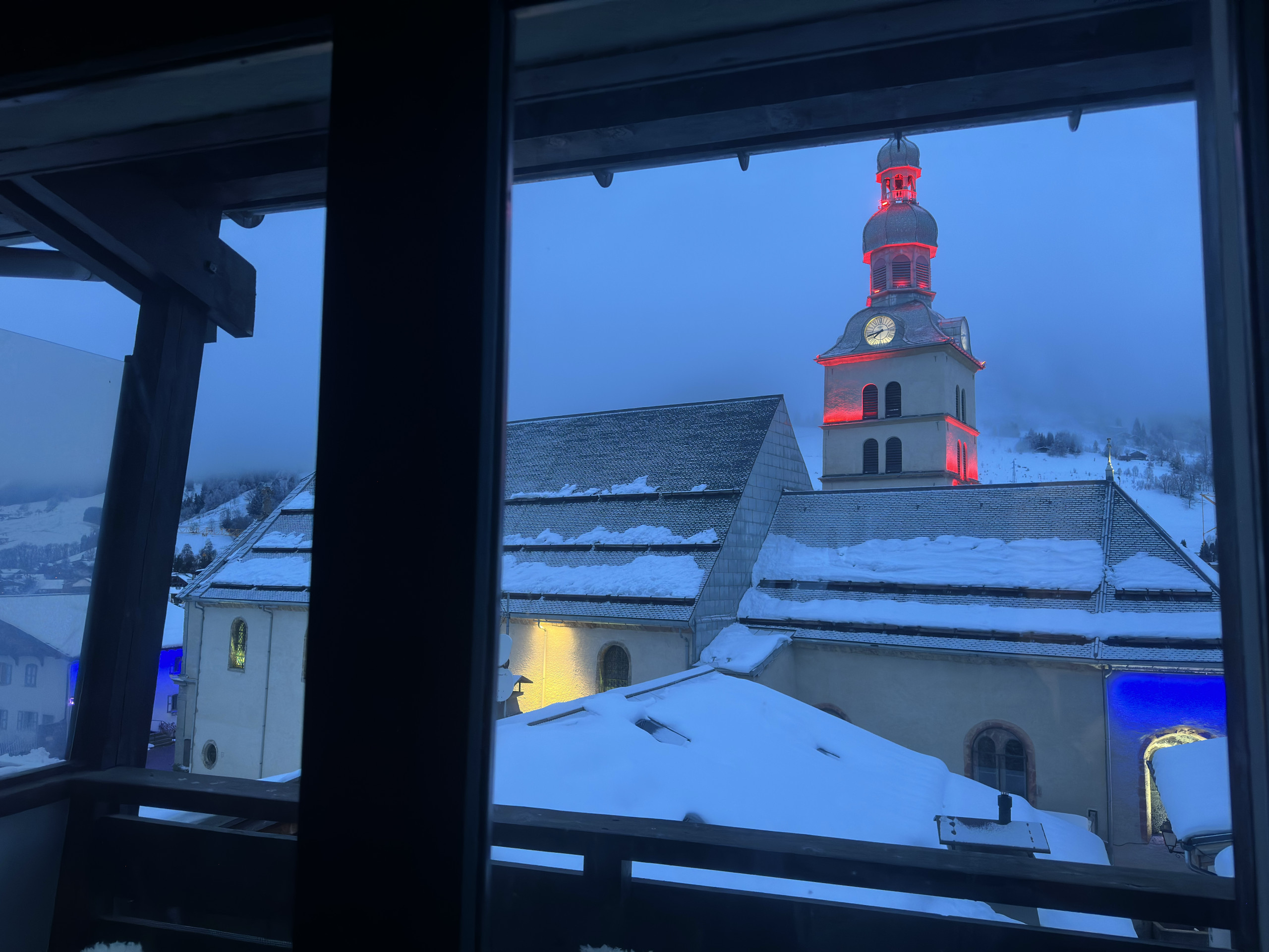 La cloche est proche du logement, mélodie très agréable qui fait parti du charme de Megève, elle est active de 7h00 à 21h00.