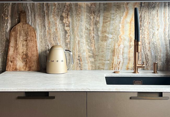 L’appartement dispose également d'une élégante cheminée à gaz, créant une ambiance chaleureuse et raffinée, ainsi que d'une cuisine ouverte ultra-moderne.
