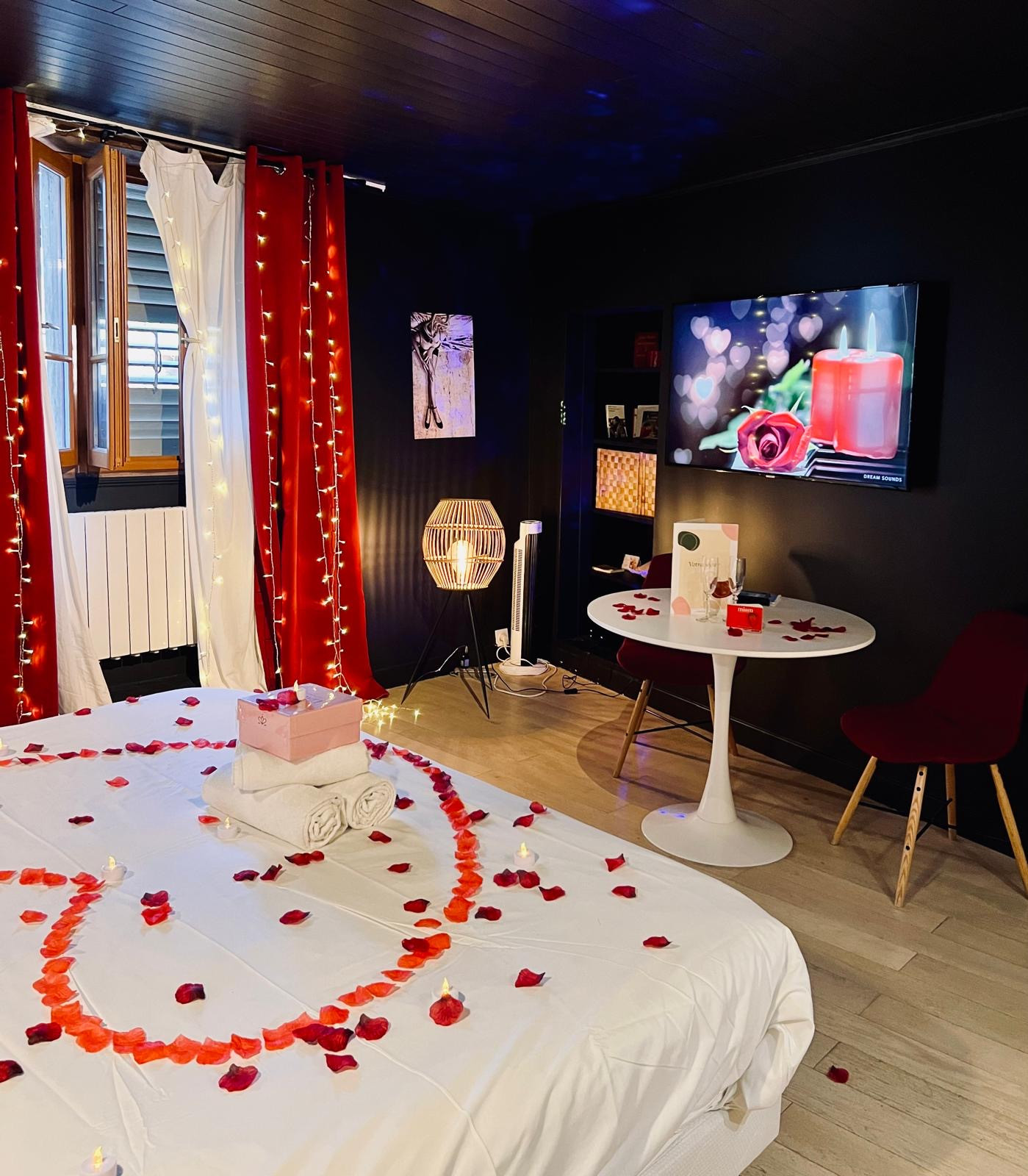 Bouquet de roses et pétales en forme de cœur, bougies sur le lit, mot personnalisé + une bouteille de Champagne 75 cl.