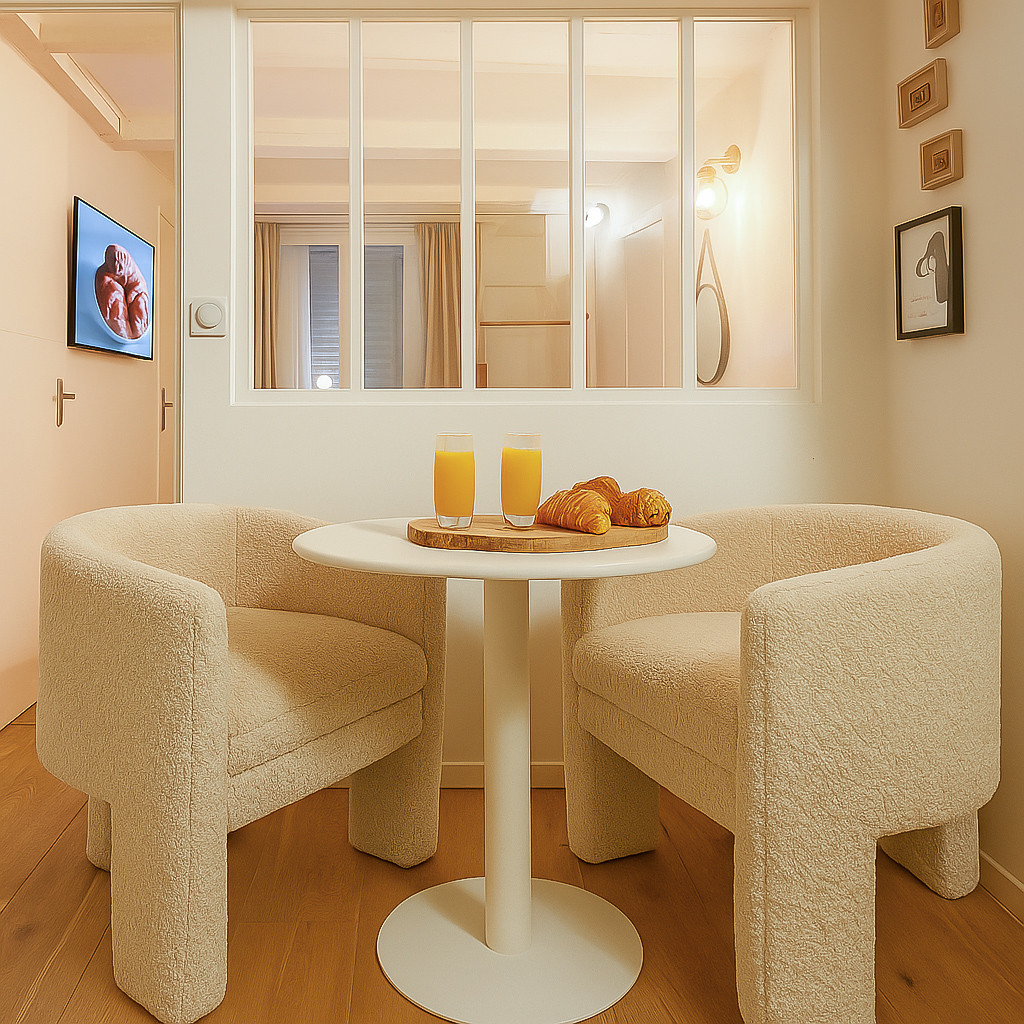 Table ronde et deux fauteuils bouclette pour partager des moments romantiques à deux.
