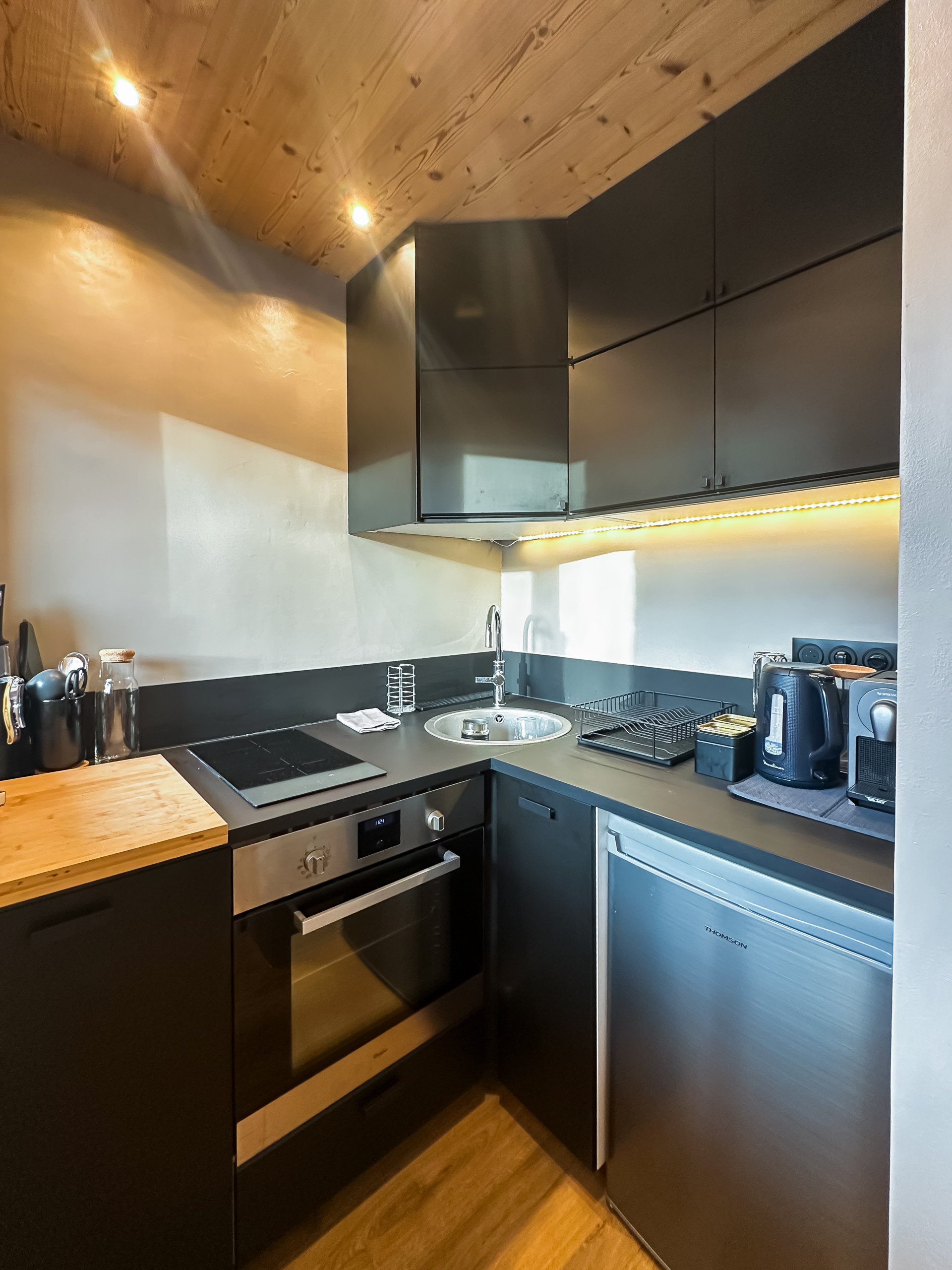 Equipée avec plaques, four, hotte, micro-onde, réfrigérateur, machine à café Nespresso lave-linge.